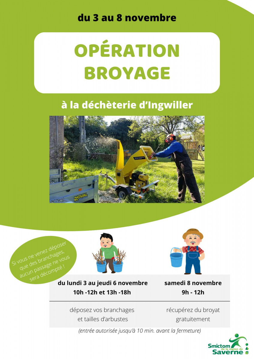 Du 3 au 8 novembre, venez déposer vos branchages et tailles d’arbustes à la déchèterie d’Ingwiller et repartez avec du broyat gratuitement !