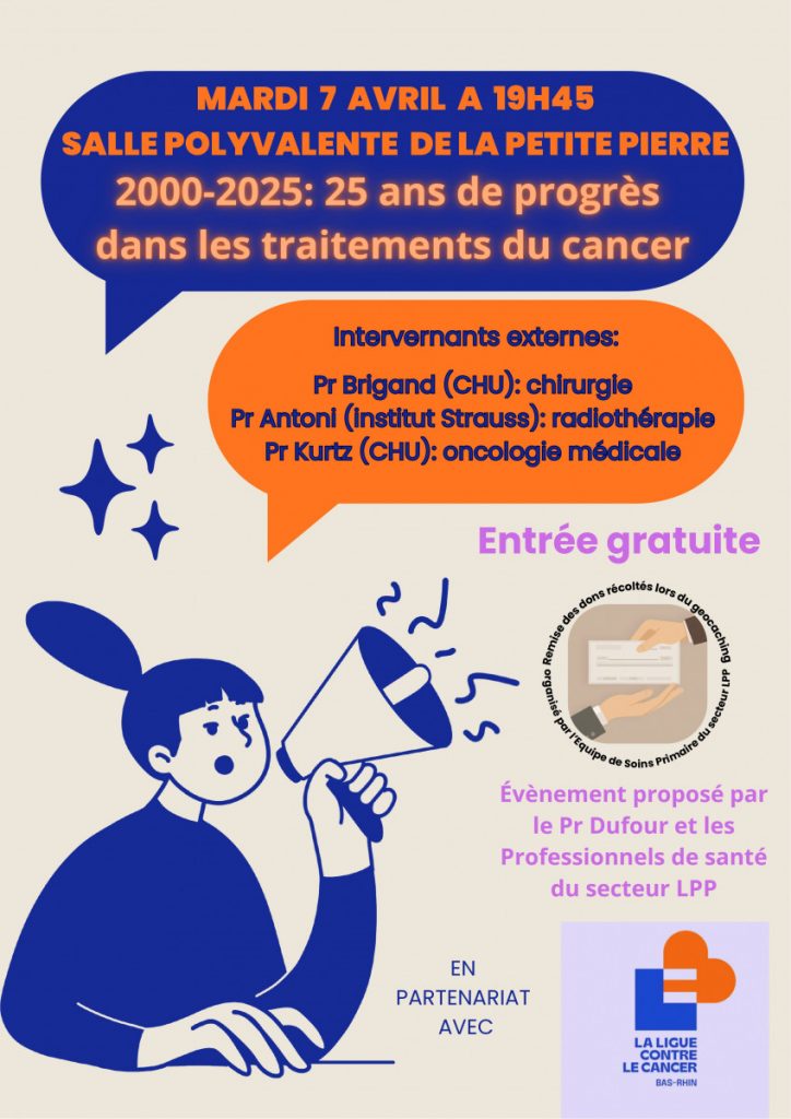 L’équipe de soins primaires de La Petite Pierre (Professionnels de santé du secteur de La Petite Pierre), vous propose une soirée d’information Grand Public avec la présence de 3 éminents professeurs de Médecine de Strasbourg impliqué dans la lutte contre le cancer pour faire un point sur les avancées des traitements au cours des 25 dernières années.